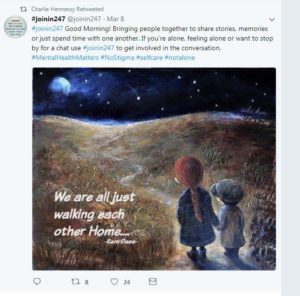 They all use the hashtag #joinin247 to promote their causes to lonely or vulnerable people (the hashtag appears to have been specifically created to help lonely people connect with each other, for support). #joinin247 was one of the first things @CharlieBinbags shared on Twitter: